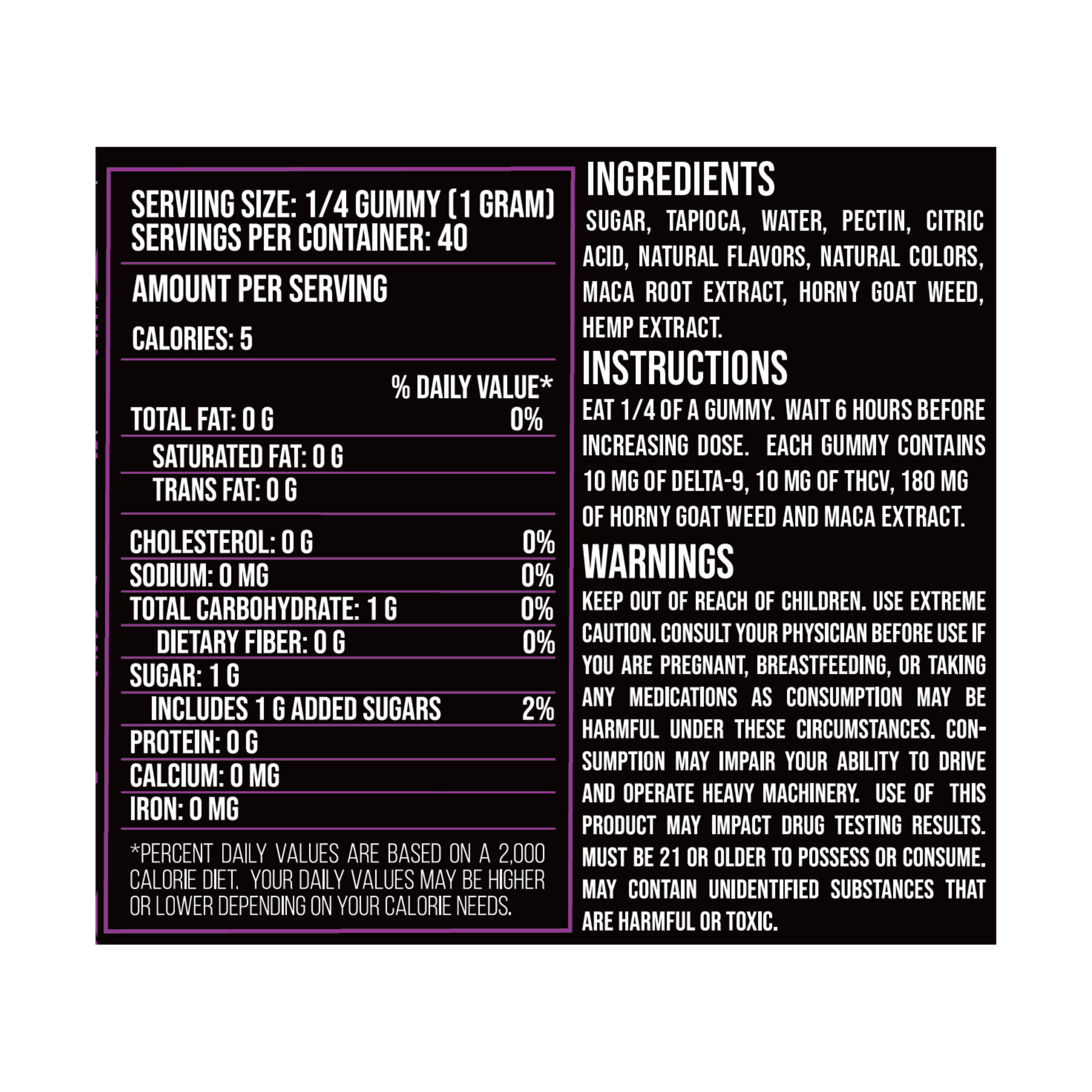 Turn up the heat with Bhumi's Passion Gummies, expertly crafted to enhance intimacy and elevate pleasure. Each 10-count bag delivers a potent blend of 10mg Delta 9 THC for deep connection and 10mg THCv for stamina, plus Horny Goat Weed to boost libido and Maca Root for lasting energy.