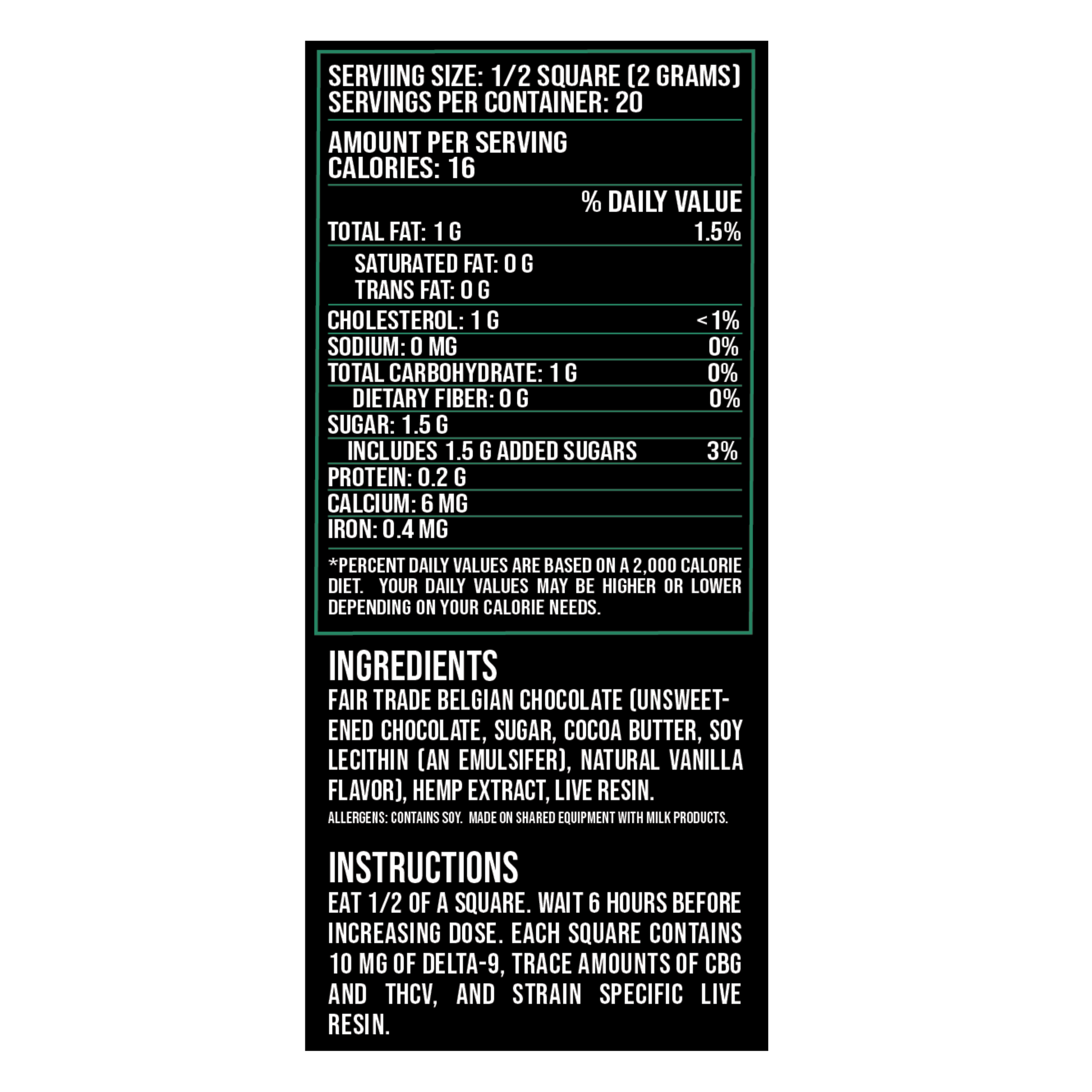 Each bar contains 100mg of Delta 9 THC, conveniently segmented into 10 pieces with 10mg per piece, allowing for precise and controlled dosing. Designed for those seeking creativity, focus, and a boost of daytime energy, this premium edible offers the perfect balance of potency and flavor.